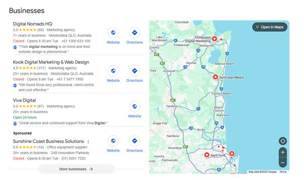 - User Behaviour and Personalisation: Google also looks at how people interact with your business online (clicks, calls, or directions requests) and personalises results based on searcher’s location, history, and preferences.