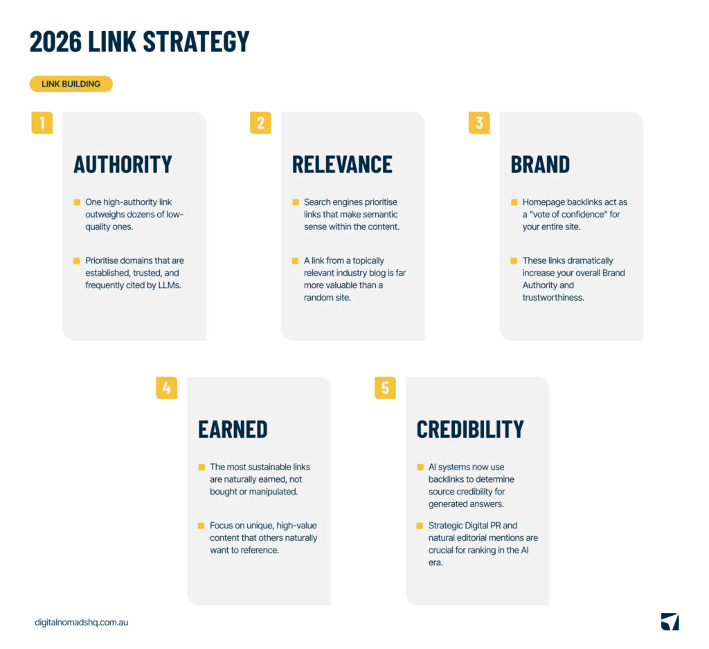 A single high-authority, relevant (niche) link provides significantly more value than dozens of low-quality or irrelevant links. Prioritise links from established, trusted domains and domains frequently cited by LLMs.