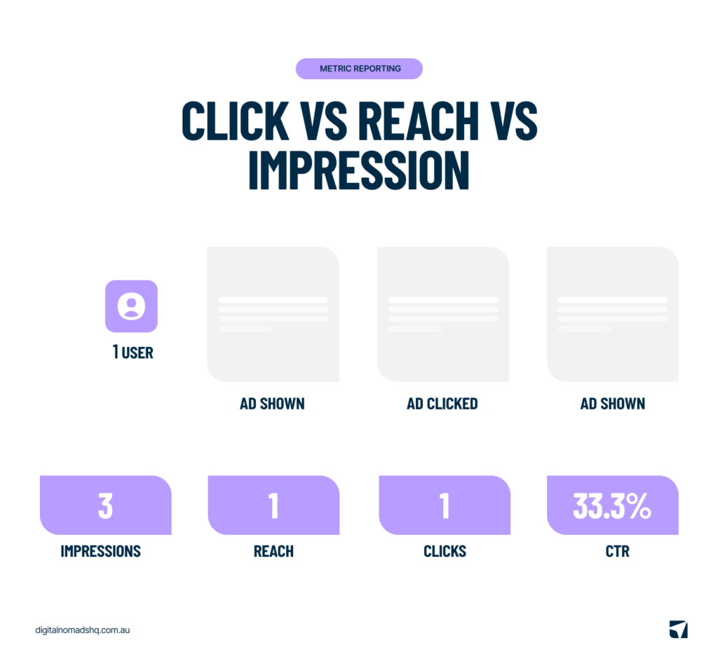 To put it simply: if one person sees your ad three times and clicks once, that’s three impressions, a reach of one, and one click.