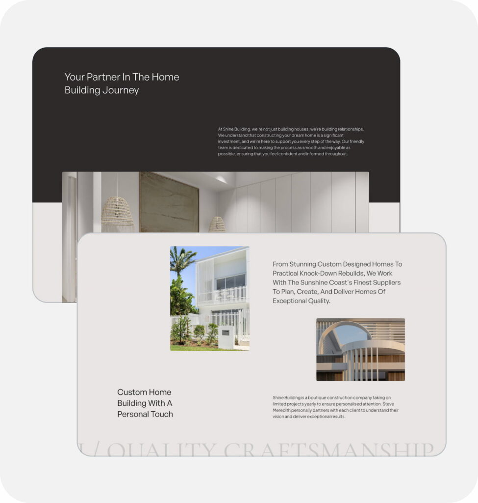 Shine Building were clear on what mattered from day one. Keep it simple, let the work shine, and make the experience feel as high quality as the homes they deliver. That direction made the project smooth, and the final site feels like a true extension of their brand and process.